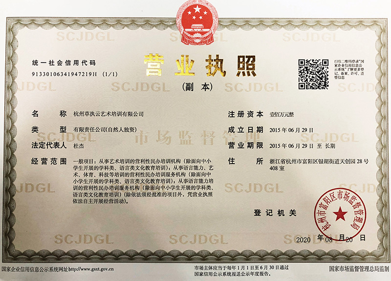 画室办学历史已久,隶属杭州草执云艺术培训有限公司。为国家工商注册认证的教育培训机构。画室以求真实求新爱人,“山水一行,成就一生”为办学理念。以培养以德为首。德艺双馨型人才为目标。